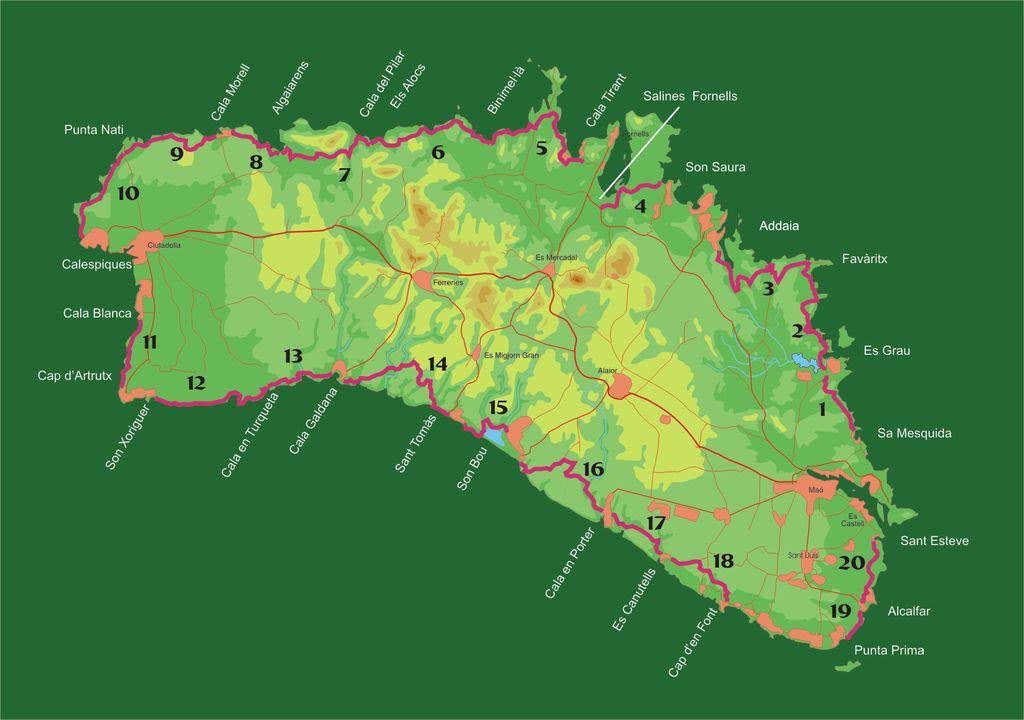 A lo largo de 185 kilómetros, rodea toda la isla de Menorca, siguiendo la costa a través de naturaleza virgen, calas escondidas, bosques, acantilados y caminos históricos.